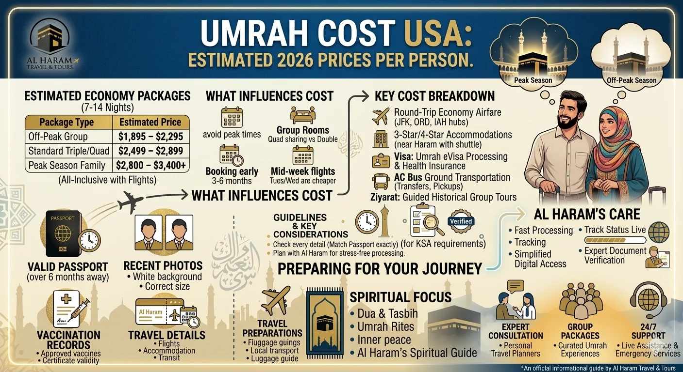 In this guide, alharamtravelntours provides a detailed breakdown of Umrah package pricing for travelers from the USA. This article covers informational, transactional, and navigational insights to help you compare packages, estimate costs, and select the best option for your budget and travel needs.